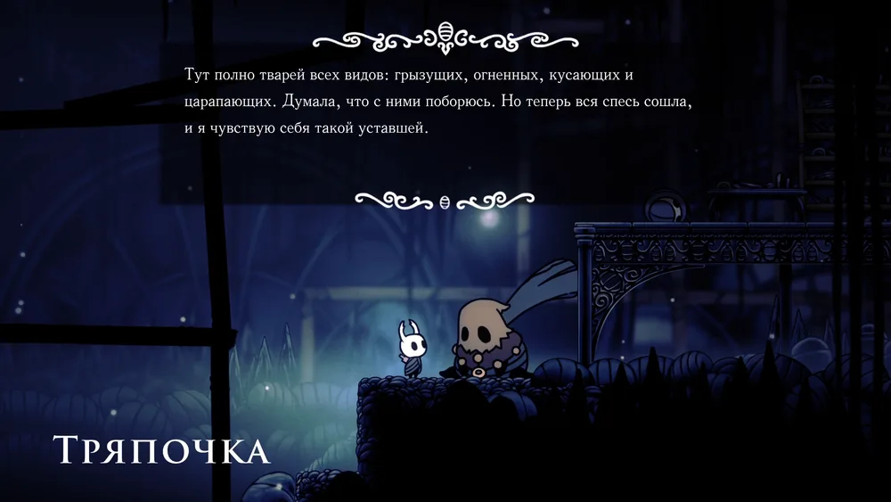 Вскоре я добрался до огромной открытой области под названием Далекая деревня с платформами, ведущими куда-то наверх. Область Судя по указателю где-то недалеко наверху находится Вокзал Рогачей, до которого я добраться не успел. Пропрыгав по платформам, я зашел в какой-то кокон с несколькими невраждебными жучками и скамейкой. Сел на скамейку и попался в ловушку, прилипнув к паутине.