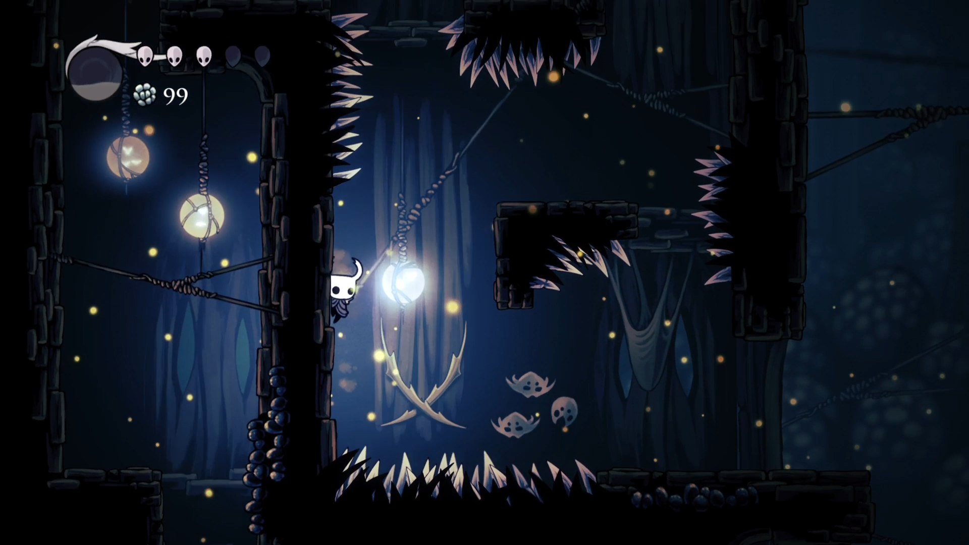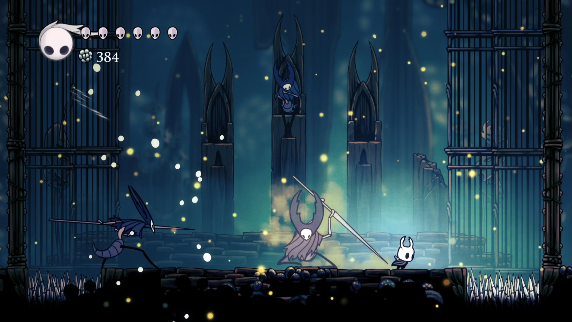Спуск вниз был вполне типичным для Богомолов. Закрытые двери, рычаги и куча врагов. Только, в отличие от верхней части деревни, здесь стало побольше сложного платформинга с шипами. Медленно, но верно, мне удалось спуститься вниз с первого раза. А внизу меня ждали Лорды Богомолов, к которым я пришел всего с двумя масками. Разумеется отъехал я с первых же двух атак босса. Поэтому о нем попозже