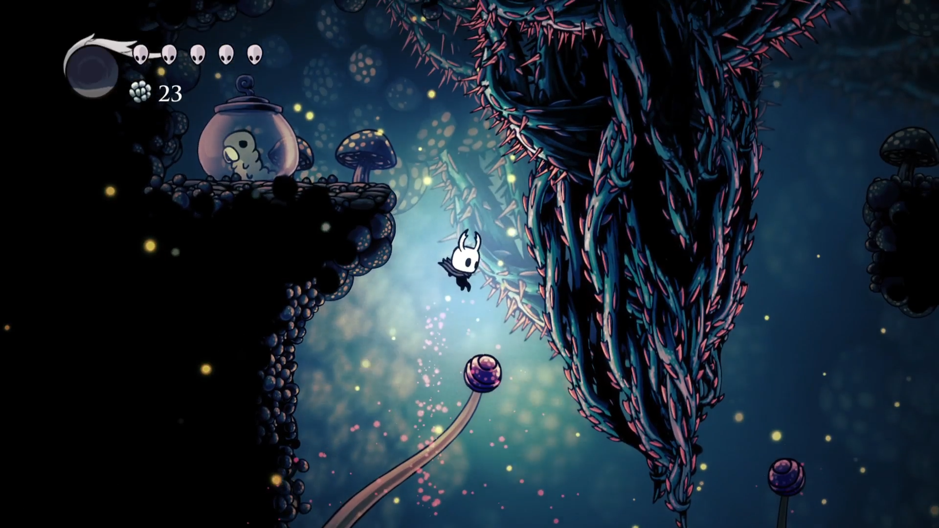 Сначала вернемся и обследуем до конца грибные пустоши. С помощью Клешни смог забраться на еще одну стену, преодолеть платформинг по грибам и спасти гусеничку. А дальше еще одна паркур секция с шипами и ядовитой жижей, в конце которой лежал амулет. Отличный старт!