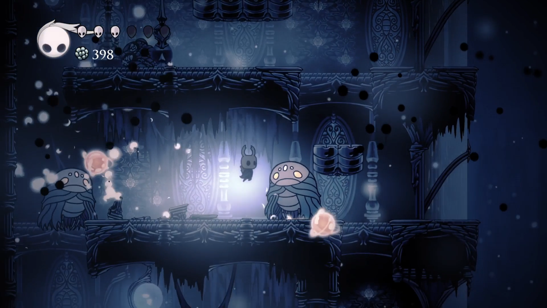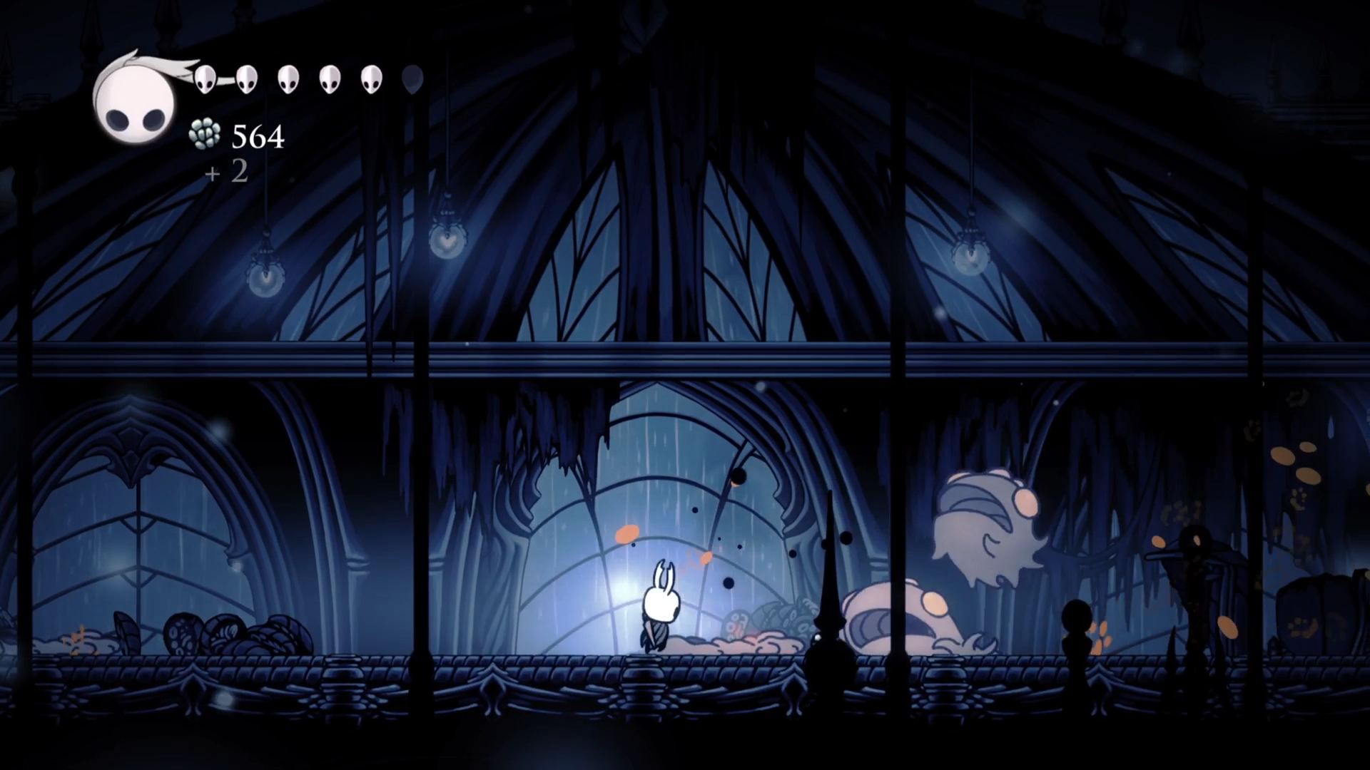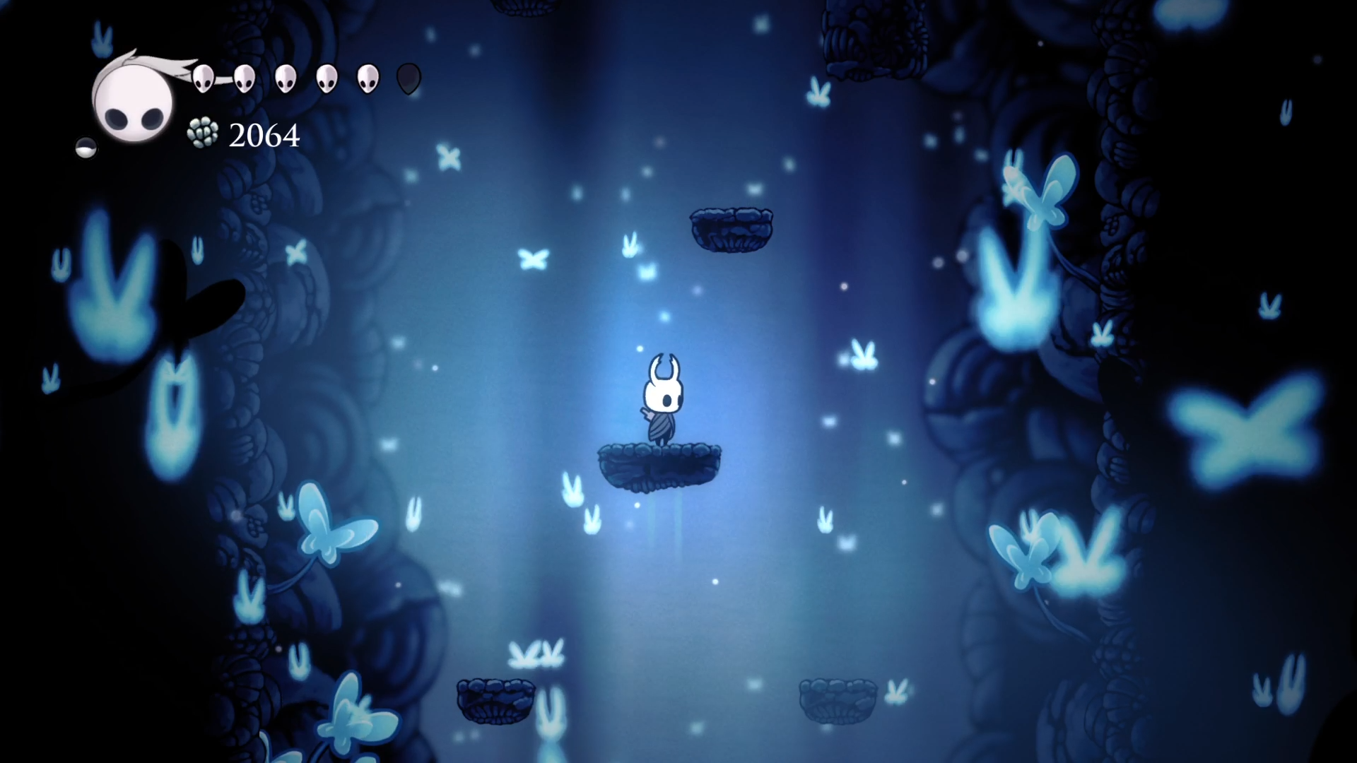 Второе темное место, на которое я натыкался ранее, располагалось на Воющих утесах, те что на самой верхней части карты на Западе. Вот здесь уже было поинтереснее. Довольно большая многоуровневая пещера, усеянная шипами и врагами. А в конце внезапно, очень красивое место, усеянное парящими синими цветами. Спустившись в самый низ я обнаружил могилу павшего воина и амулет Благословение Джонни с весьма необычный эффектом, увеличивает количество масок, но превращает их все в живокровь. То есть ХП ставновится примерно на половину больше, но отхилить душой его нельзя, только восстановить на скамейке. Учитывая, что амулет занимает аж 4 ячейки, я решил с ним не экспериментировать.