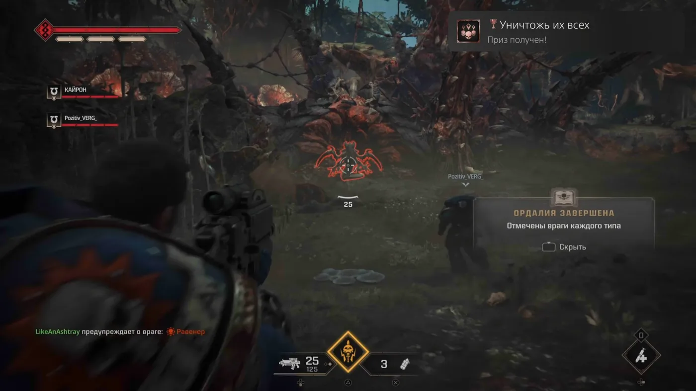 Вернувшись в настоящую кампанию, трофеи посыпались как тираниды на высадку. Большинство сюжетные и выпадают сами — просто проходите игру. Из того, что требует чуть больше внимания: