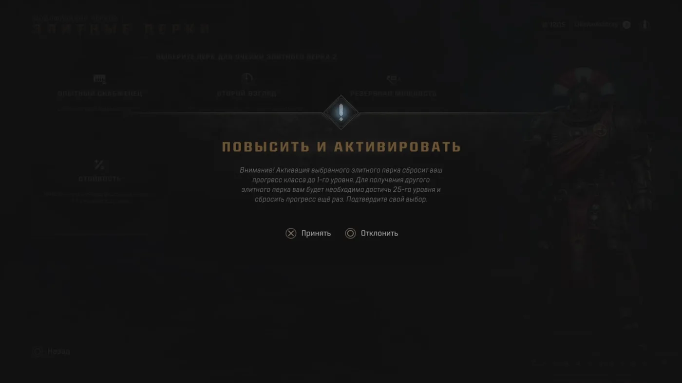 При достижении 25-го уровня игра предлагает получить уровень престижа и открыть дополнительный перк. Звучит заманчиво. Фишка в том, что если согласиться — весь прогресс перков сбрасывается, а персонаж откатывается до первого уровня.
